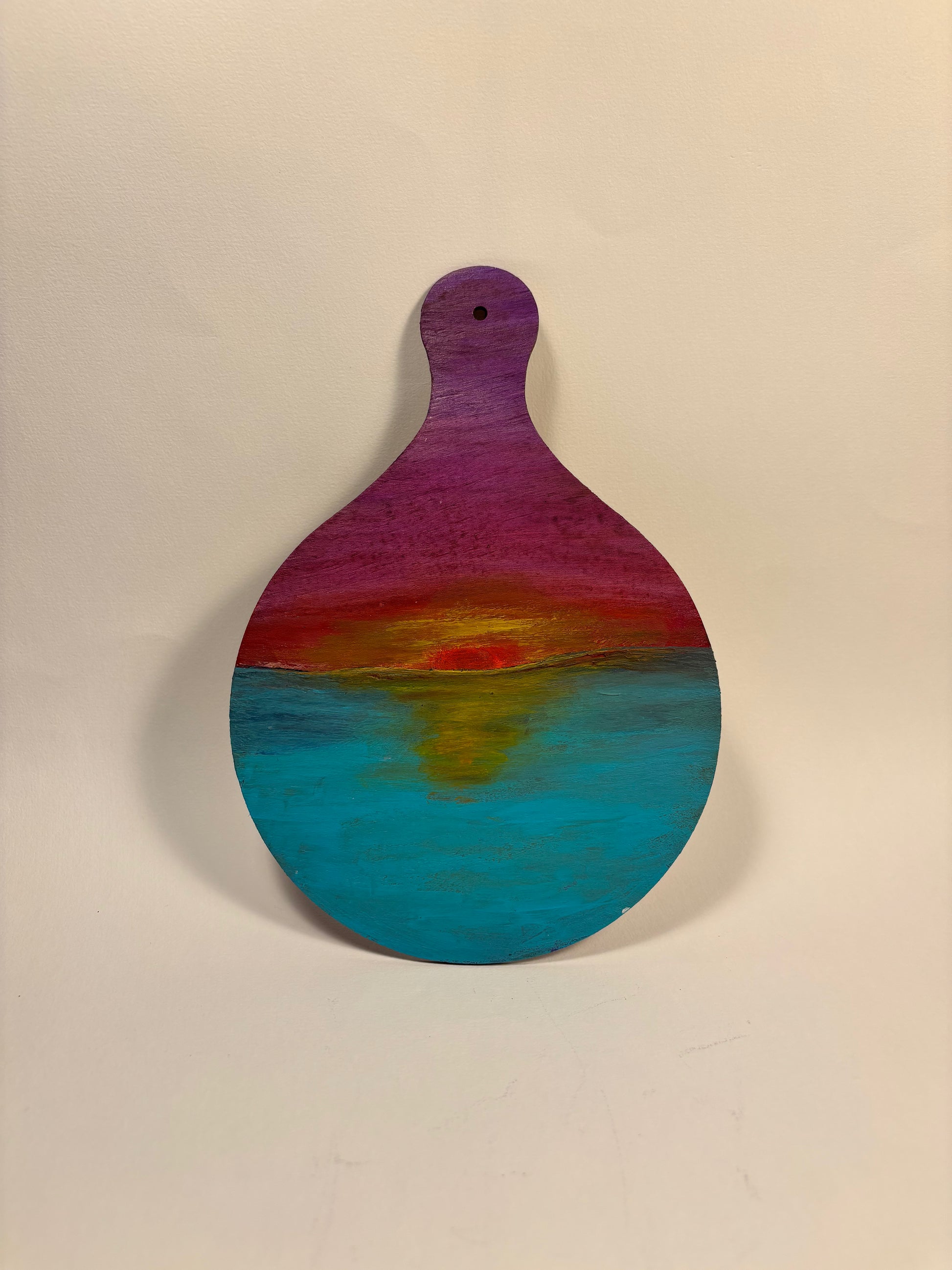 Vivid Sunset is another petite paddle artwork from the main paddle art collection by Weaves and Trinkets. Inspired by the golden glow of twilight skies, and hand-painted in radiant coral and amber tones, it captures a dreamy moment of light just before dusk.