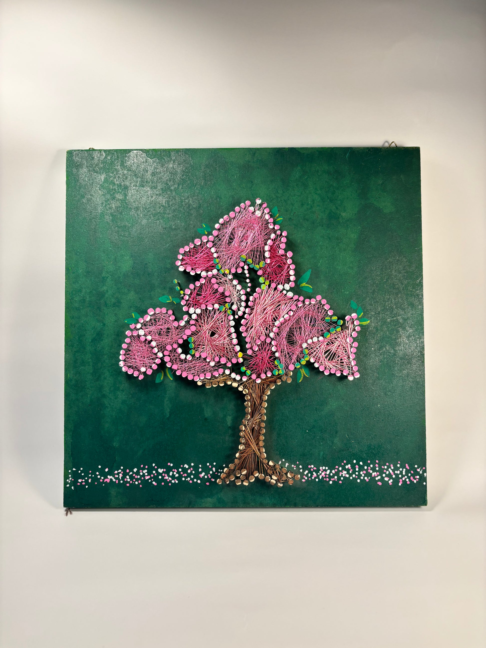 Bring a touch of nature indoors with our exquisite string art piece featuring a cherry blossom tree set against a rich forest green background. Handmade with intricate detailing, the delicate blossoms pop beautifully, creating a serene and inviting atmosphere. Perfect for nature lovers, this artwork adds elegance to any space and makes a lovely gift for special occasions.