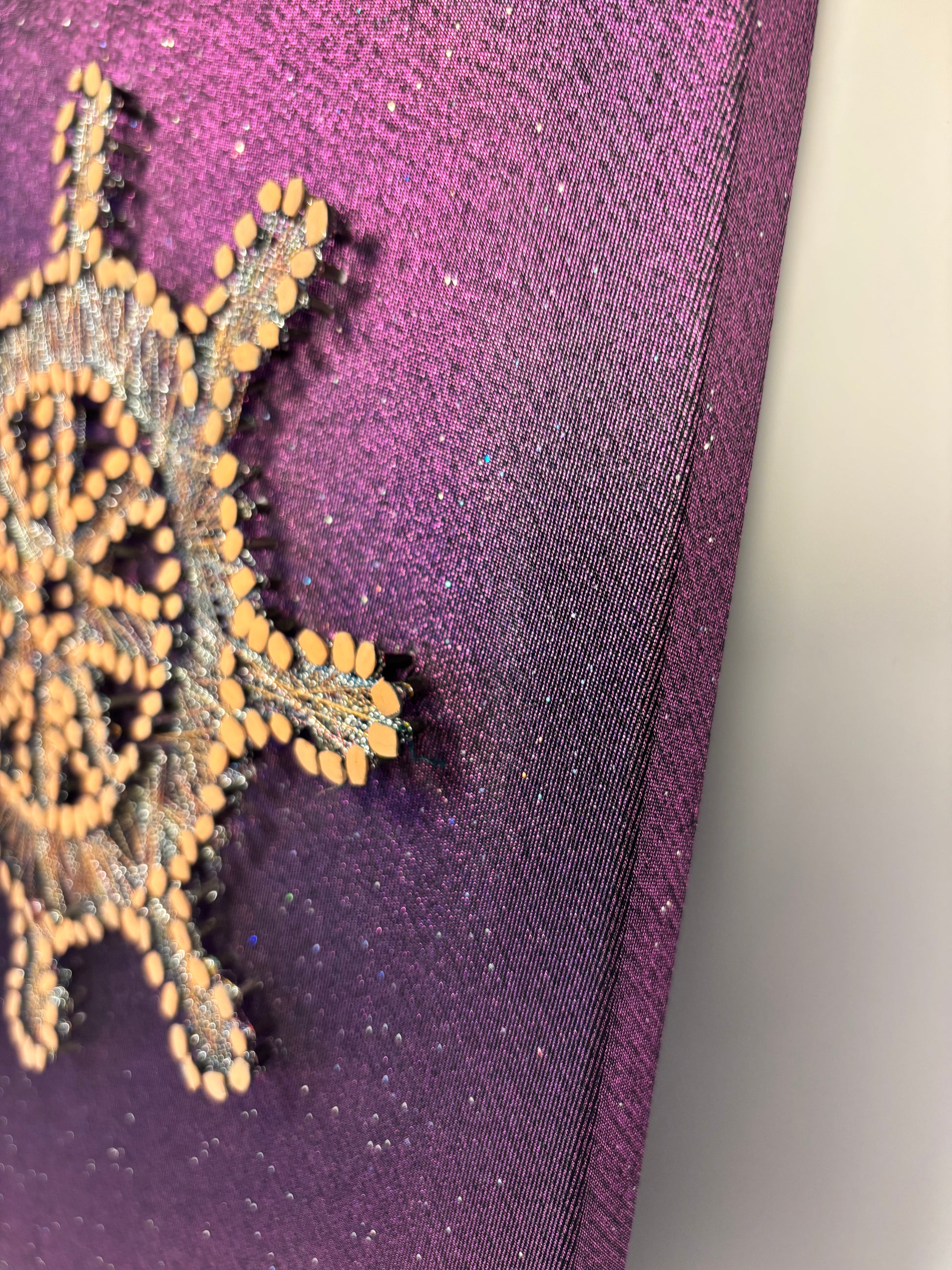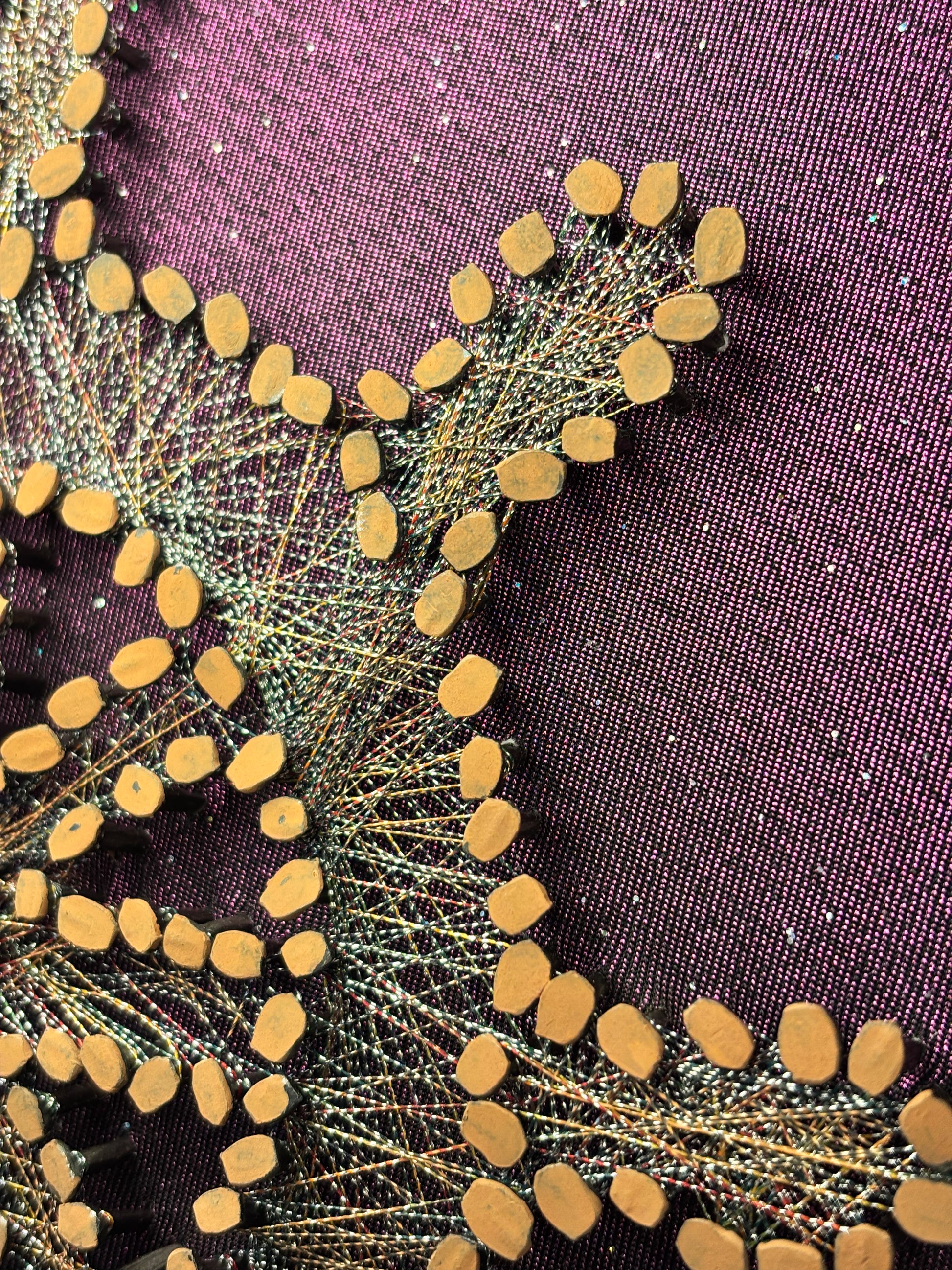 The iconic sailor’s wheel is shaped using high-quality metal nails and strung with a single satin thread that shifts between warm brown and silvery tones; symbolizing earth and water in harmony. The subtly sparkled purple fabric base, mounted on wood, was carefully chosen to evoke intention and elegance, the core spirit behind this piece.